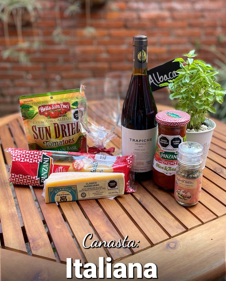 1 Botella de Vino (Trapiche Pinot Noir o 3V Casa Madero o Ensamble).1 Paquete de Pasta Panzani de 500 gr.